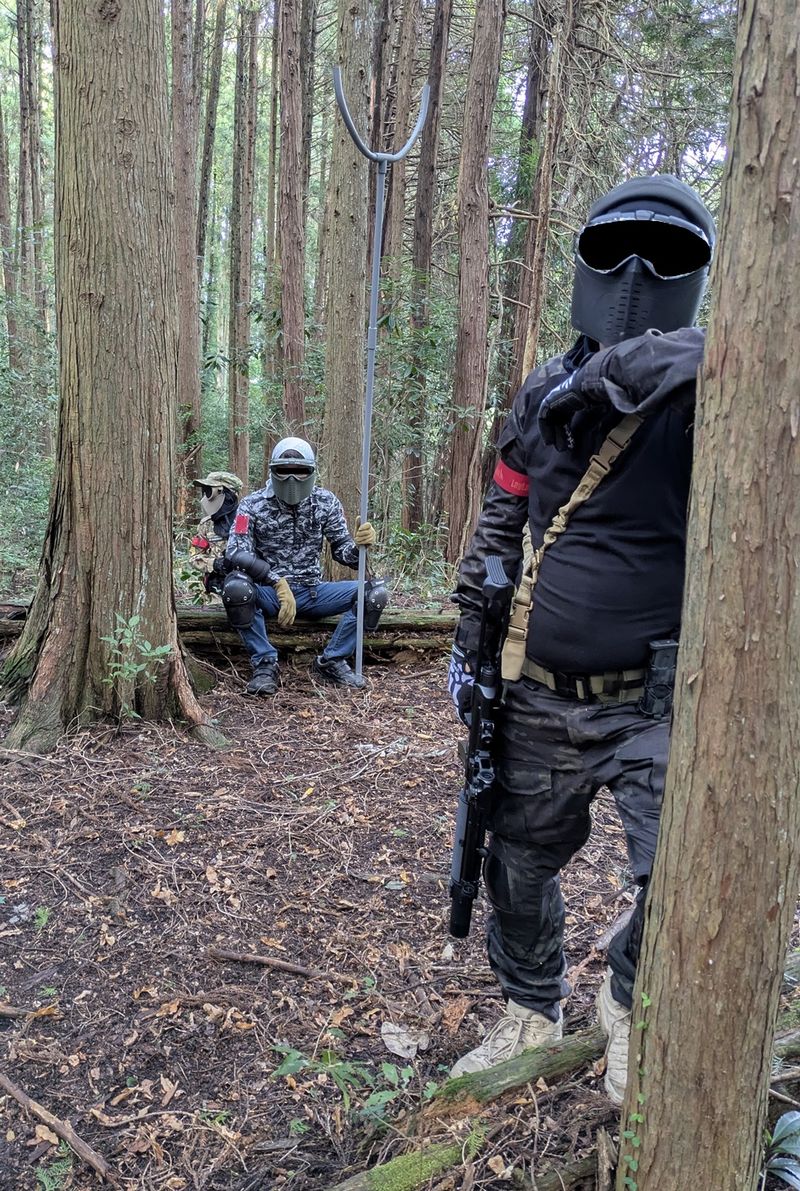 特殊ルールのボス戦でサスマタを装備し本陣に陣取るフミオ氏と護衛。